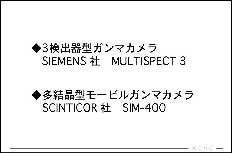 | 二日目 | ・架台、寝台 点検 ・SPECT均一補正データ収集 (GP,HR:40Mc) ・SPECT円柱ファントム試験 ・WB画像試験 ・データー撮影、整理 ・中心位置補正(年1回) | ・LSFデーター収集 ・SPECT均一補正データー (HR,FAN:20Mc) ・JISファントム性能試験 (Hot−Uni) ・寝台 点検 ・データー撮影、整理 | ・点検後NEMA確認 ・基本性能収集 (直線性、分解能ファントム) ・SPECT均一補正データー (HR:60Mc) (FAN:30Mc) ・中心位置補正(年1回) ・SPECT円柱ファントム収集 ・データー撮影、整理 |