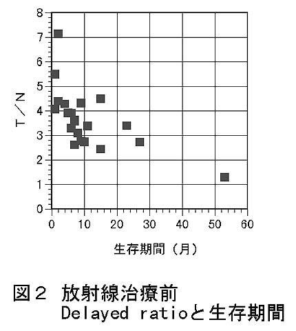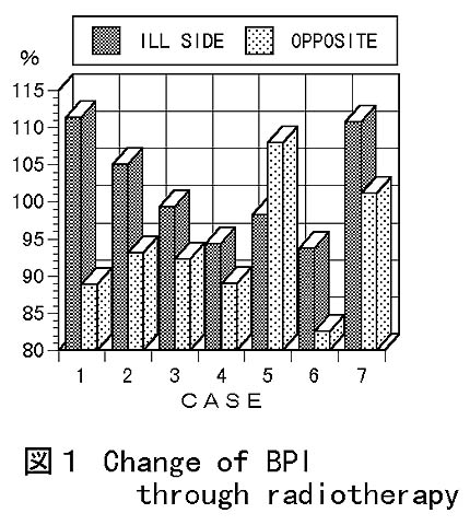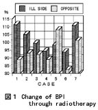 放射線治療後長期間経過した症例で脳全体の血流が低下することがある。それでは治療直後には脳血流は増加するのかあるいは低下するのか?この疑問に答えるため99m-Tc ECDを用いて、比較的転移数の少ない脳転移患者の全脳照射前後での脳血流を測定した。結果は図1のようになり、転移病巣のある側の半脳平均血流は治療後に増加し、健常側の血流は低下した。血流低下の最も著しかった症例では治療後早期に髄膜播種をきたしたことから、予後との関係について現在検討中である。