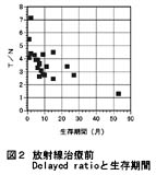 201-Tl SPECT を用いて治療効果を評価することができると考え、食道癌の放射線治療前後に施行してきたが、治療後にタリウムの集積がほとんど消失するような症例でも早期に死亡することがあり、タリウムの集積と予後との関係について検討してみた。その結果治療前の後期像でのタリウムの集積と治療後の生存期間との間には負の相関関係が得られた(図2)。従って治療開始前にある程度の予後の予想ができることになる。また腔内温熱療法を併用した症例では上記より予想される生存曲線を越える症例が多く、治療法の評価にも使えると考えられる。| 表1 肺血流シンチグラフィの適応 |