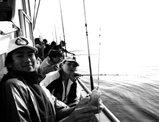 釣りと云えば小学生の時に川釣り、浜釣りを少々やった程度。船の揺れで酔ってしまうことも考えてためらったものの、一度経験してみてもいいかな、と思い直し参加することに決めました。 釣りを少々やったことがあると云っても、ただ竿と餌を持ってフラフラしてただけのド素人なので、何が必要なのかわかりません。科の先輩方に聞き、クーラーボックスは必要だということなので、購入することにしました。 そして当日、クーラーの中にいただいた缶ビール24本を詰めて茅ヶ崎港へ。酔い止めの薬を飲み、7時頃出船しました。空は晴れ上がり、風は適度に冷たく、朝日を浴びて、緊張することもなく、気持ち良く釣場へと向かいました。釣場に着いて、竿の扱い方等を教わり、「よし!」と、気合いを入れて始めました。魚が掛かるとググッと引かれる感じになると聞いてましたが、当初はおもりの重さで沈み込む感じと区別出来ず、何度も竿を上げては確認してみました。さて記念すべき第一投は何と大物中の大物!!「地球」!? とても釣り上げるどころではなく、リールを巻上げた目の前には何にも無い糸のみが...。気合いを入れた第一投はただ岩に挟まれただけで空しく散り果て、船頭さんが新しいカゴを取り付けてくれている間、釣り始めた周りの方たちの様子をボケーっと眺めているしかありませんでした。 さて、竿が出来上がり気合いを入れ直して、再度チャレンジ。しかし、数十分たっても何の感触もない。見かねた先輩、S々木さんが「貸してみ」と私の竿を取り上げた数秒後、しっかりと魚は喰い付いていました。「こういうふうにやるんだよ」と教えてくれたもののなかなか魚は喰い付いてくれません、とその時おもりとは少し違う感触が!ググッと竿が引かれる感じで...「これか!」、リールを巻き、糸で指を切りながら急いで釣り上げるとソーダガツオがかかってくれていました。この感激はたまりません!その後2、3匹と釣れだし、いつしか餌を詰めて放り込んでは十秒とたたない内に釣れるようになり、時間を忘れ、気が付いた時には10数匹にもなっていました。目的のイナダを釣り上げることは出来ませんでしたが、最終的には20数匹と思いがけず大漁で、クーラーを購入した甲斐がありました。たださすがに全部は食べ切れないので、御近所におすそ分けをしました。 もちろんその日の夕食はソーダガツオのさしみや塩焼きで、さしみなどはコリコリと身が引き締まって何とも云えず(自分で釣ったという感慨もあってか)美味しかったです。翌日も味噌漬け、サバずし等の魚三昧でした。これが釣りの面白さなのかなと1回参加しただけで思ってしまい、当初のためらいはどこへやら、素晴しい体験で一日を楽しく有意義に過ごすことが出来ました。 |