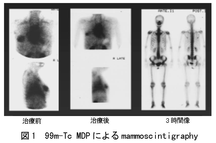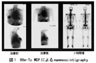 (1)現在できうることとして、第一に一つの検査でできる限り多くの情報を得ようとする姿勢が必要である。例えば図1に示す99m-Tc MDPによるmammoscintigraphyの有用性については、すでにイタリアのグループを中心に確立されており、乳癌の骨転移検査に際しては試みる価値がある。また、糸球体濾過物質である99m-Tc DTPAを使用した腎シンチにパトラックプロット処理を行うことで、通常得られるGFRに加えて本来得られない腎血漿流量(RPF)を同時に求めることができる。さて、上記の3項目についていくつかの例を呈示すると、