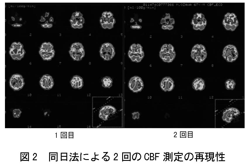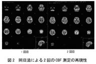 a)より正確な病態の把握のために、MRIとのfusion画像の作成の必要性が高まると思われる。これによってMRIのすぐれた解剖情報と核医学の機能情報をドッキングする事ができるからである。ただし現状のソフトウェアは機能的にも価格の面からも不十分である。また脳血流シンチでは、まさに病態の正確な把握のための定量測定が不可欠となると言える。さらに脳循環予備能としてダイアモックスに対する反応性を測定する場合に、従来は2日に分けて検査を行っていたが、今後はコストや患者の利便を考慮して同日法で行われるようになると予測される。信頼できうる方法が確立されれば、患者の状態の変化なしに評価できるため、むしろ2日法より正確であろう。図2に我々の方法(仮にsequential dynamic methodとする)で求めた2回のCBF測定の安定性を示す。ダイアモックス負荷を行わない場合の2回の半脳平均血流値の変動は数パーセント以内であった。次いで