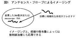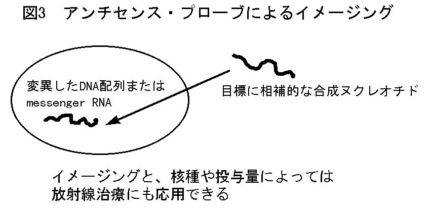 例えば不活化ヘルペスウイルスのチミヂンキナーゼを、癌細胞の中にのみ導入してやることができれば、ガンシクロヴィルなどのウイルスのチミヂンキナーゼによって代謝されることで抗ウイルス活性を発現する薬剤が、抗癌剤として選択的に効果を発揮することになる。問題は目標である癌細胞内だけに、ある程度のウイルスのチミヂンキナーゼが導入されたかどうかということを確認する手段である。ここで標識したデオキシフルオロウリジンを投与すると、ウイルスのチミヂンキナーゼが細胞内に活性を持っていれば、代謝されて取り込まれるために画像として描出されることになる。全く非侵襲的に導入遺伝子の取り込まれた様子がモニタリングできるわけである。このような全く新しい核医学検査が必要とされる時代が来るのではないだろうか。最後に標識アンチセンスによるイメージングについて述べたい。多くの疾患において遺伝子のレベルで異常をきたしている。例えば癌の場合には、いわゆる癌遺伝子に変異を生じていることが多い。DNAやメッセンジャーRNAの変異した部分に相補的な合成ヌクレオチドを合成して、標識後投与すれば極めて特異的な核医学診断が可能になるはずである(図3)。