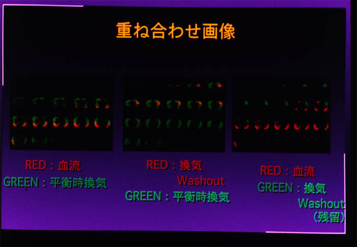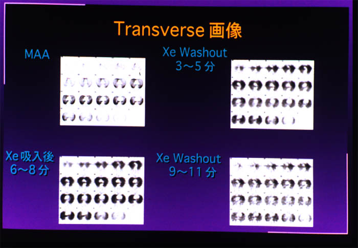99mTc-MAA肺血流SPECTでは、両上肺野の血流低下がわかります。133Xe 肺換気SPECTでは、平衡時(吸入後5〜6分)において両肺野にほぼ均等にGas分布が見られますが、Washout時でなかなかGasが呼出されていません。特に左上肺野の呼出遅延が確認できます。(図2)