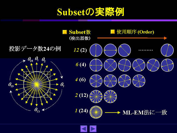ただし、すべての角度データを使って計算しないので、subsetの作り方によって必ずしも収束するとは限らない。このsubsetの数や使用する順序などは特に決まったルールはないが、なるべく離れた角度の投影データ毎にsubsetを構成するようにしている。これをFig.2に示す。subsetが1の場合は、一度にすべての角度の投影データを使うことになるので、これは元々のML-EM法と一致する。現在では、EM法といえばほとんどの場合、OS-EM法と考えてもよい。