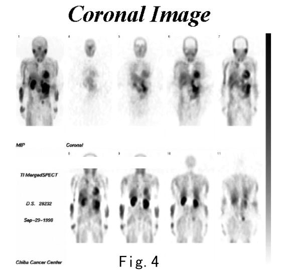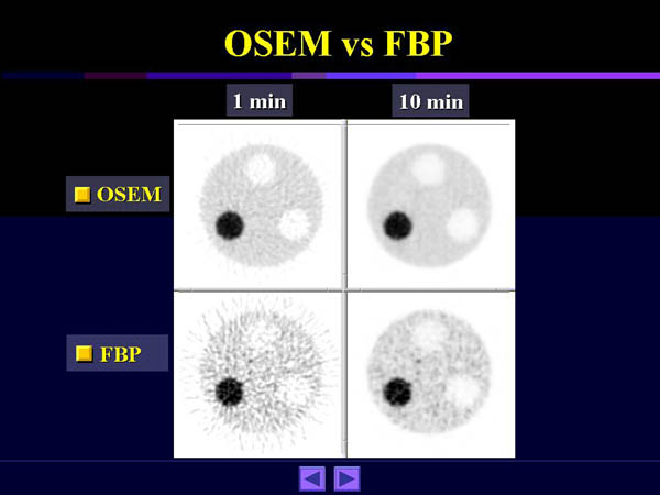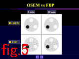 これを検証するためにF-18 FDGとPETを用いたファントム実験を行った。収集時間を1分と10分の2種類とし、FBP法とOS-EM法で画像再構成したものをFig.5に示す。10分収集のデータをFBP法で再構成したものと、1分収集のデータをOS-EM法で再構成したものとで、ほぼ同等のS/Nであることがわかる。