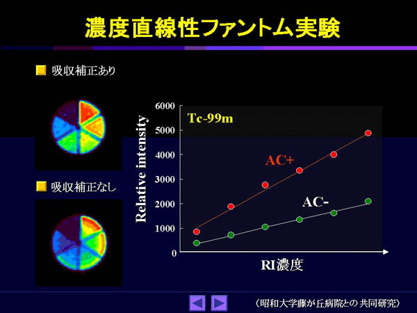 吸収補正なしでは中心部においてへこみが見られるのが、吸収補正ありではほぼフラットになった。ただし、均一吸収体であるために、どちらの場合でも濃度直線性に関しては特に違いはなかった。