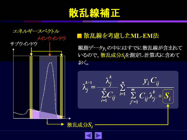 ML-EM法の主な利点としては、1)再構成値が負にならない、2)低カウント領域でのS/Nが良い、3)測定系で起こりうる物理現象を織り込んでおくことによって様々な補正ができるなどがある。3番目の理由から吸収補正、散乱線補正、分解能(コリメータのボケ)補正などを組み込んだSPECT画像再構成法が提案されている。統計学的な理論背景については詳細な解説文[5]が出ているのでそれに譲るとして、ここでは主にML-EM法の柔軟性をいかした実際の応用例を中心に概説する。