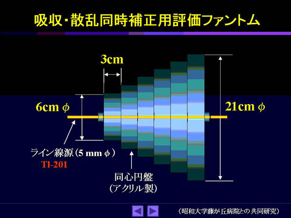 この特性は点線源の距離を変えて測定し、その点応答関数のFWHMを測定することによって知ることができる。実質的にはコリメータとシンチレータの両方による点応答関数を測定していることになる。これを使って広がりを考慮して検出確率Cijを計算すれば、分解能の補正が行えることになる(Fig.4)。最近では、F-18 FDGを511keVコリメータで測定したデータに適用して、分解能を向上させた報告もある[7]。