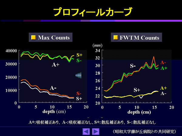 一方、FWTMで評価すると、散乱線補正さえしていれば吸収補正の有無には関係なく一定値を示した。どちらの場合でも一定値を示したのは、吸収/散乱線補正の両方を行ったものだけであった。