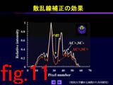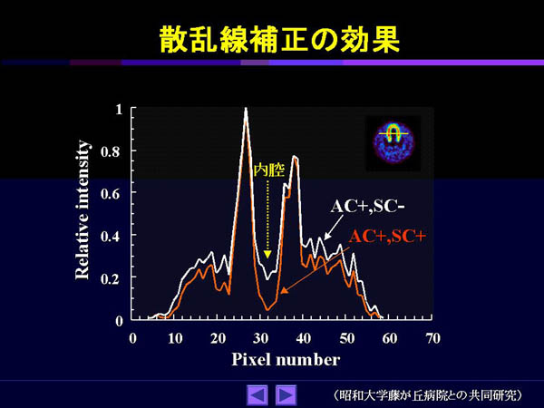 次に心筋ファントムを使用して行った実験結果をFig.10に示す[6]。心筋部分とバックグラウンドにはTl-201を入れ、TCT測定はTc-99mで行った。再構成画像からわかるように、吸収/散乱同時補正を行った時が、もっともコントラストが向上した。Fig.11にプロフィールカーブを示す。散乱線補正ありの場合は、内腔部分でカウントがほぼ0になっていることがわかる。