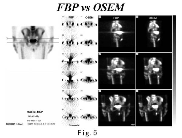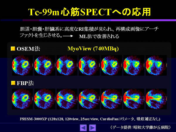 Fig.12にFBP法とOS-EM法で再構成した心筋SPECT画像を示す。OS-EM法ではアーチファクトがなくなっていることがわかる。